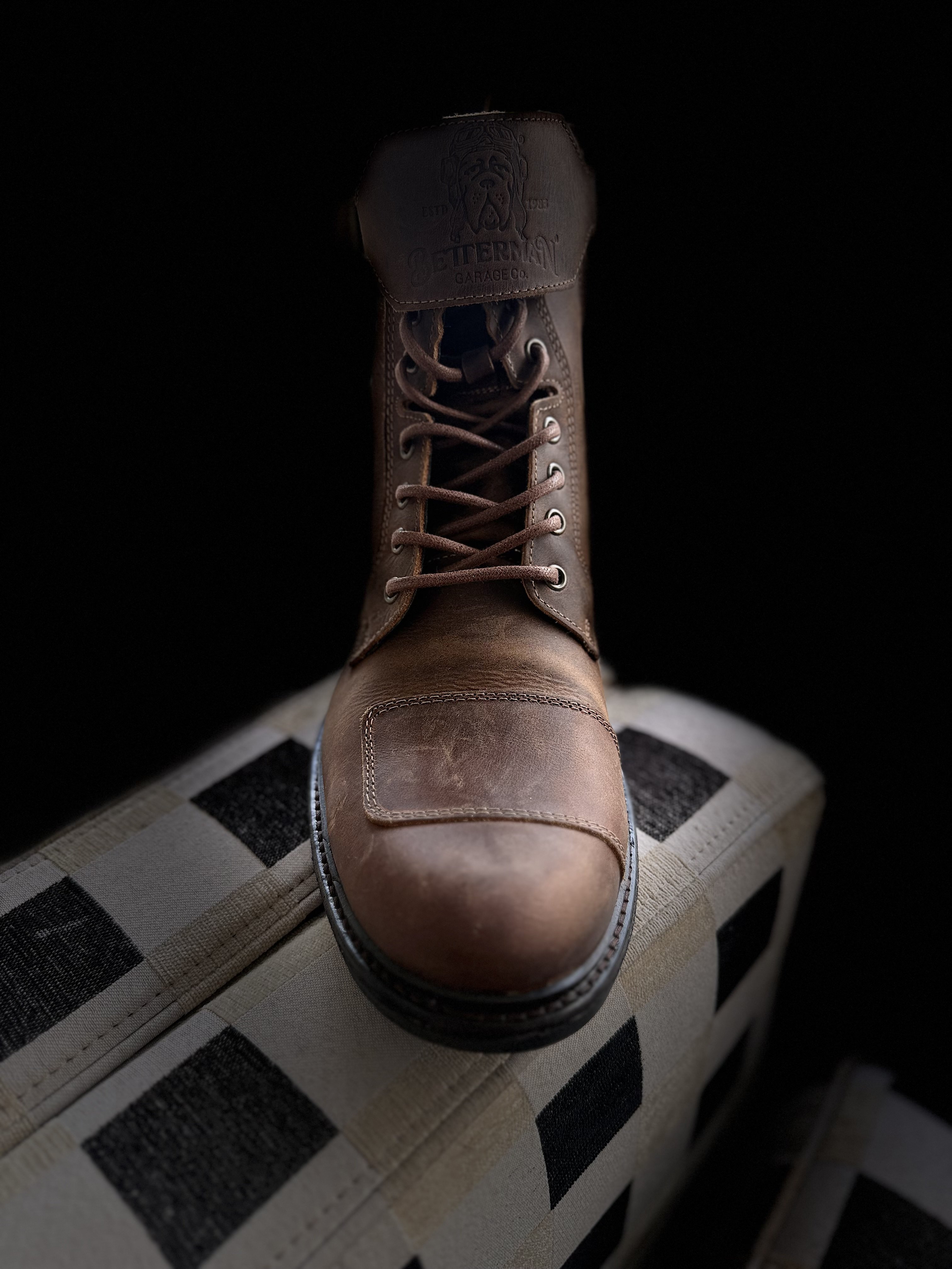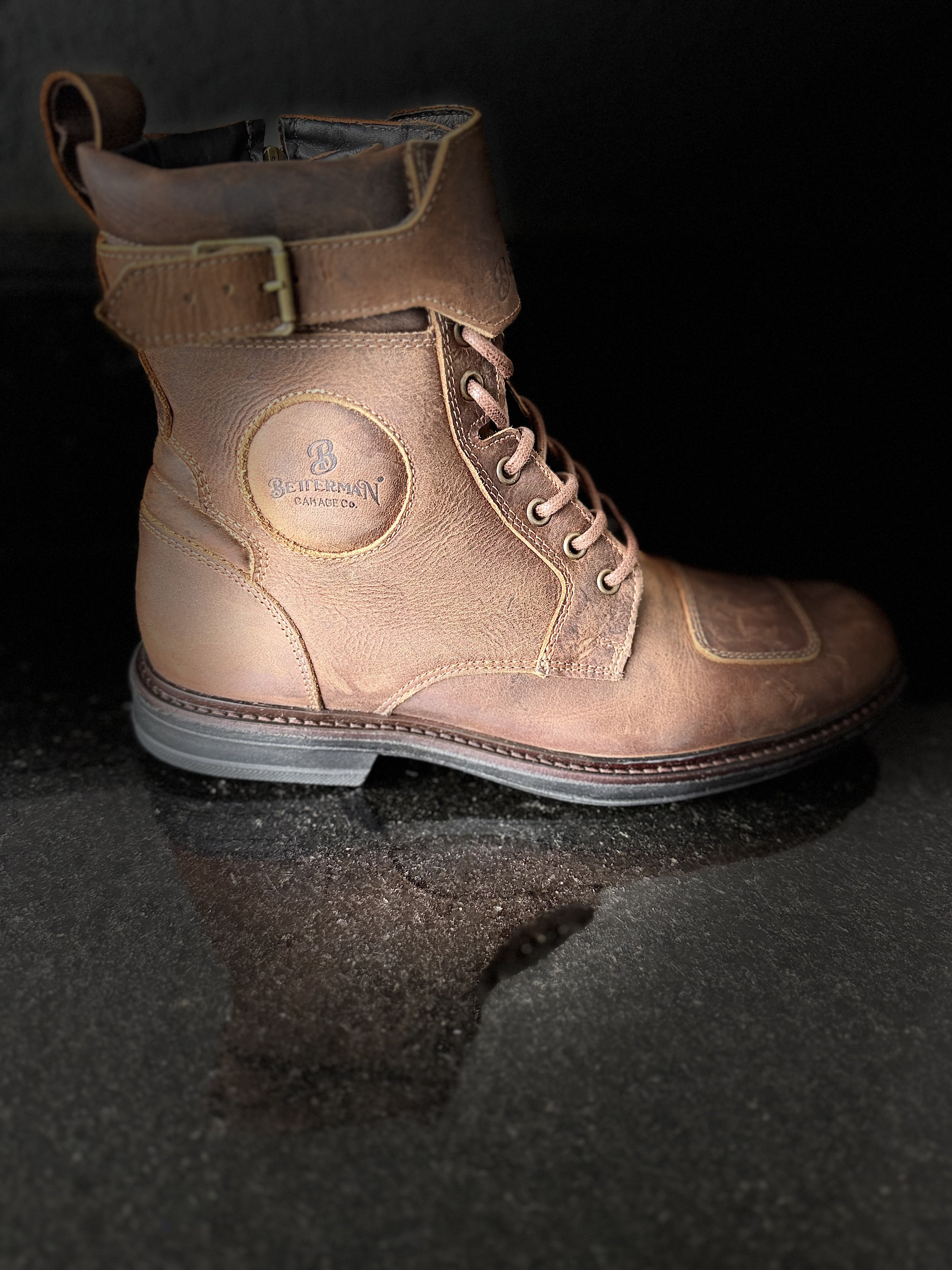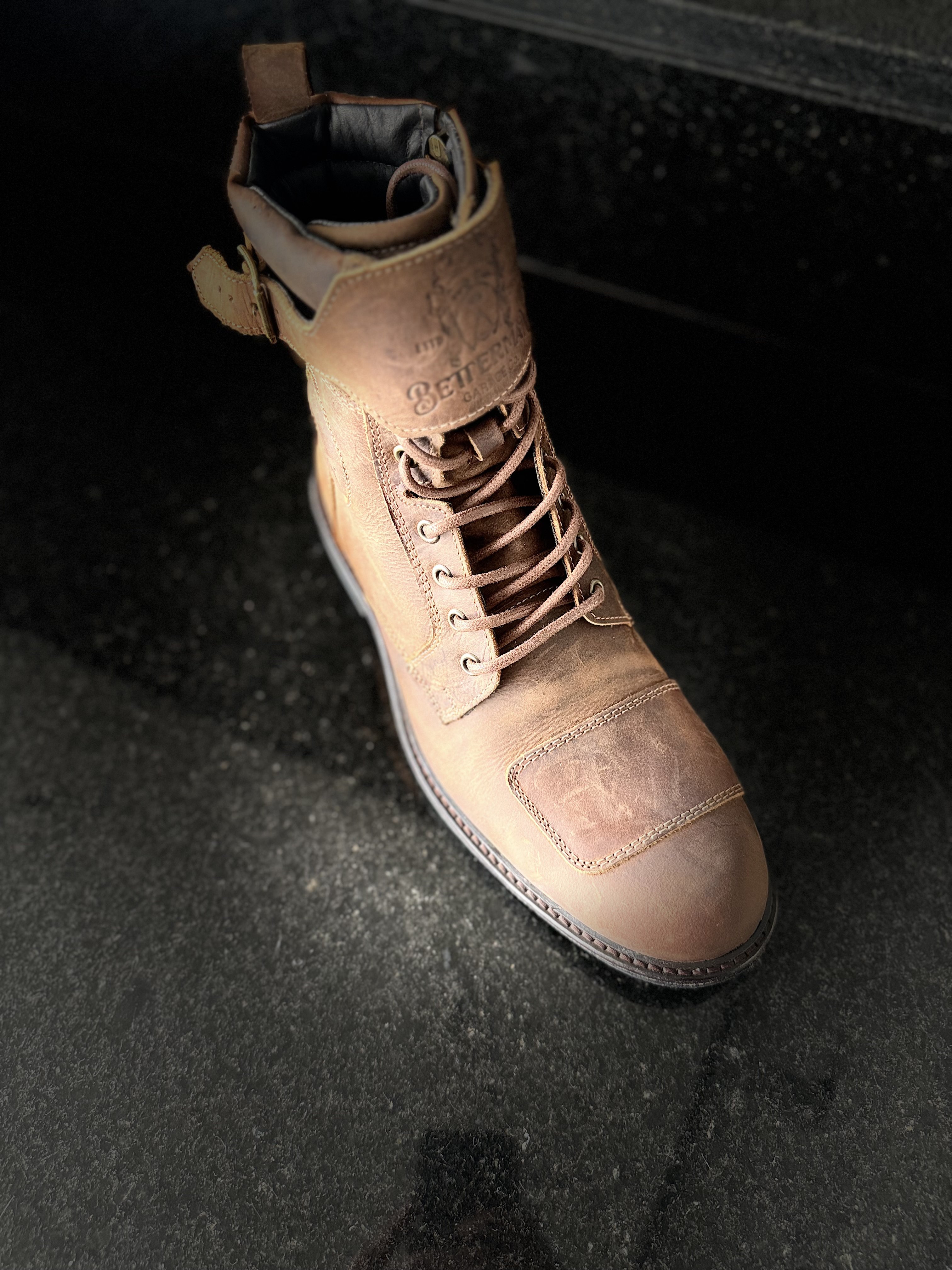 Bota com estilo café-racer , com inspiração militar, feita em couro graxo integral resistente a água. Feito por artesões altamente qualificados que sabem criar uma bota que vai durar anos e protegê-lo na estrada com proteção, estilo e conforto. Nós projetamos com ousadia em mente para garantir que todos os nossos produtos sejam tão únicos e elegantes quanto você.